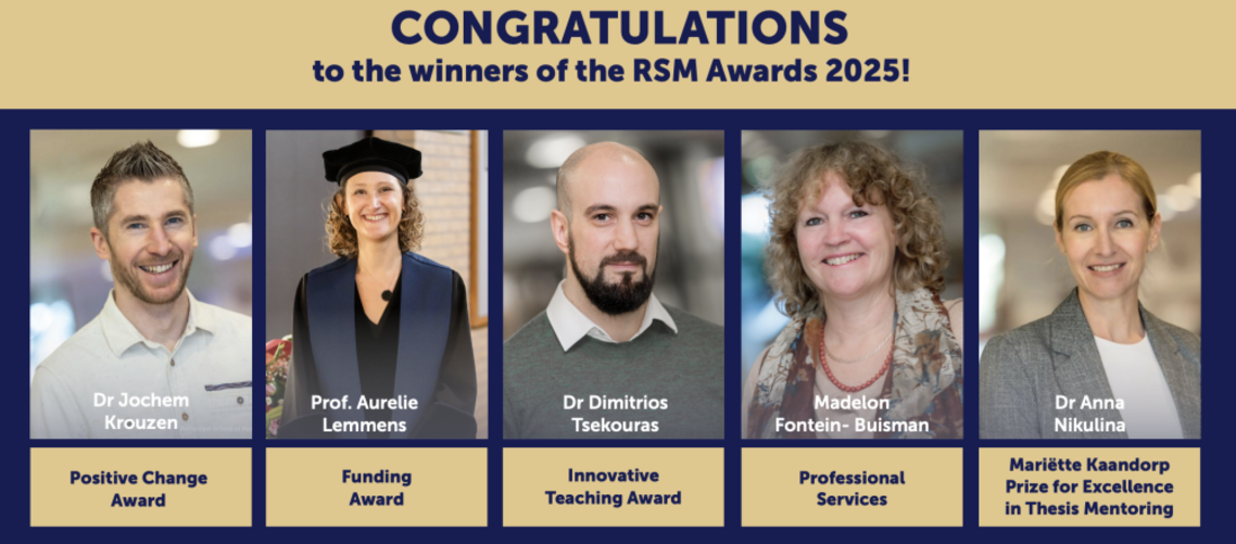 Dr Jochem Krouzen, Associate Professor in the Department of People and Organisations, won the RSM Positive Change Award, which is for an RSM faculty member, staff member or student who brings something new that helps the school fulfil its mission to be a force for positive change in the world. He teaches the course ‘The Craft of Managing for Positive Change’ to MBA students – and has designed it in a way that that considers the needs and aspirations of students seeking a meaningful, high-quality education. “His creativity shines in the innovative structure and content of the programme, which prepares students to address complex global challenges,” said his nominators. His collaborative approach engages colleagues, students, and external partners so that the learning experience becomes co-creative.