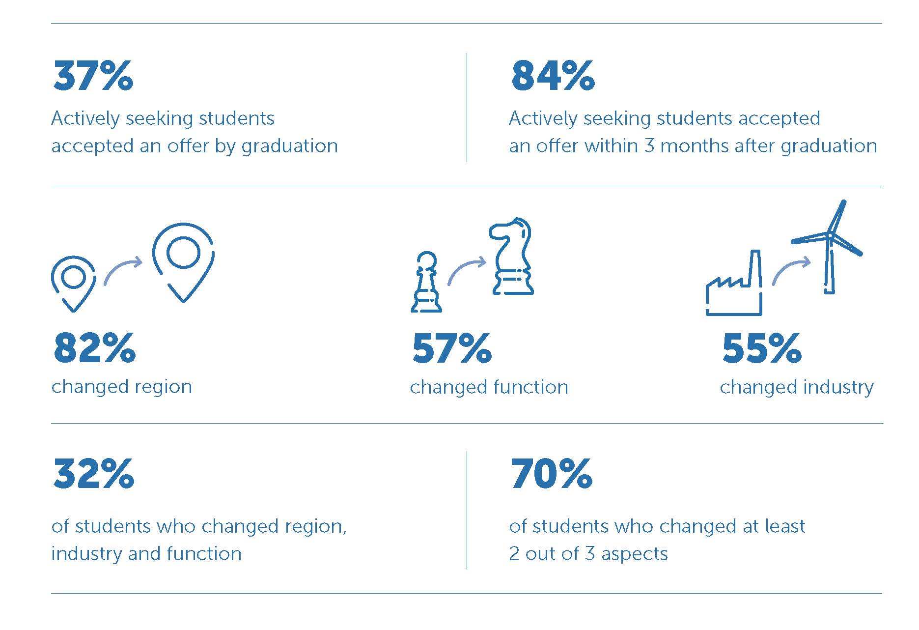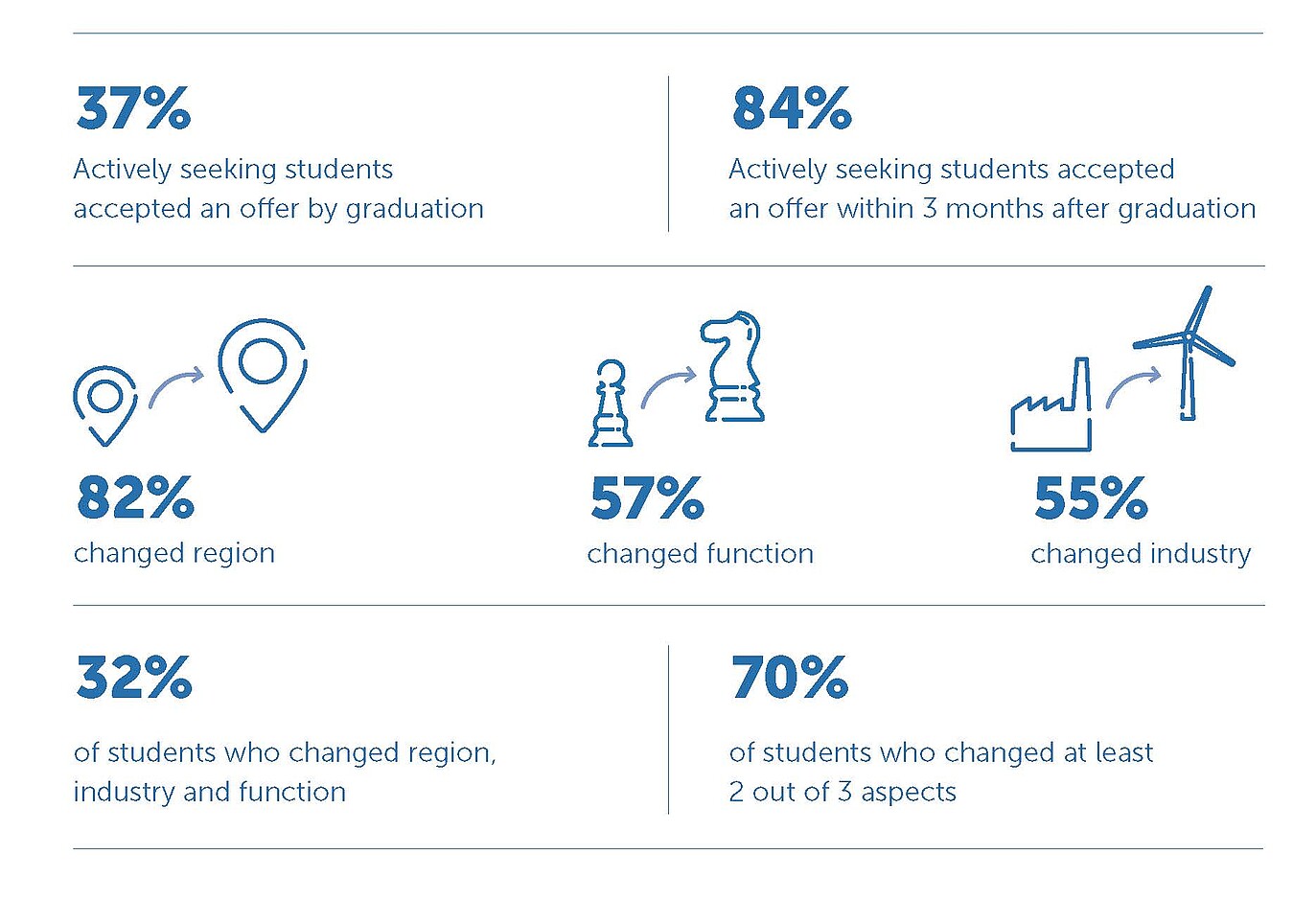 The RSM MBA graduates drive positive change across diverse sectors. Many graduates choose to stay in Europe after their MBA. The dedicated RSM MBA Career Centre supports students in finding impactful careers, providing tools and global exposure. RSM's experiential learning and skill development lead to promising prospects. The Career Centre connects students with top companies like Google, Amazon, and ASML, offering workshops, coaching, and alumni networking events. After graduation, you join a network of 45,000+ RSM alumni. RSM's MBA programmes equip ambitious graduates with the means to become a force for positive change and make a difference in the world.