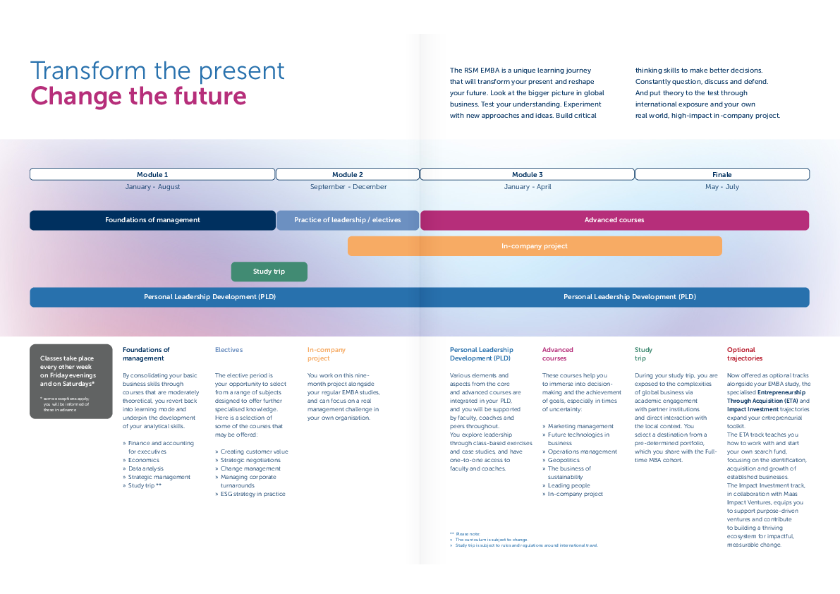 De RSM EMBA is een ervaringsgericht, praktisch en intellectueel traject dat je helpt om te reflecteren en focussen op waar je als leider naartoe wilt en hoe je daar komt.