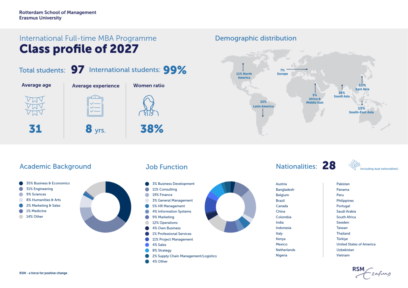 Each student has a unique educational background, on average of seven years’ work experience pre-MBA and is full of energy to put this experience and first-class education to use, potentially in your company.